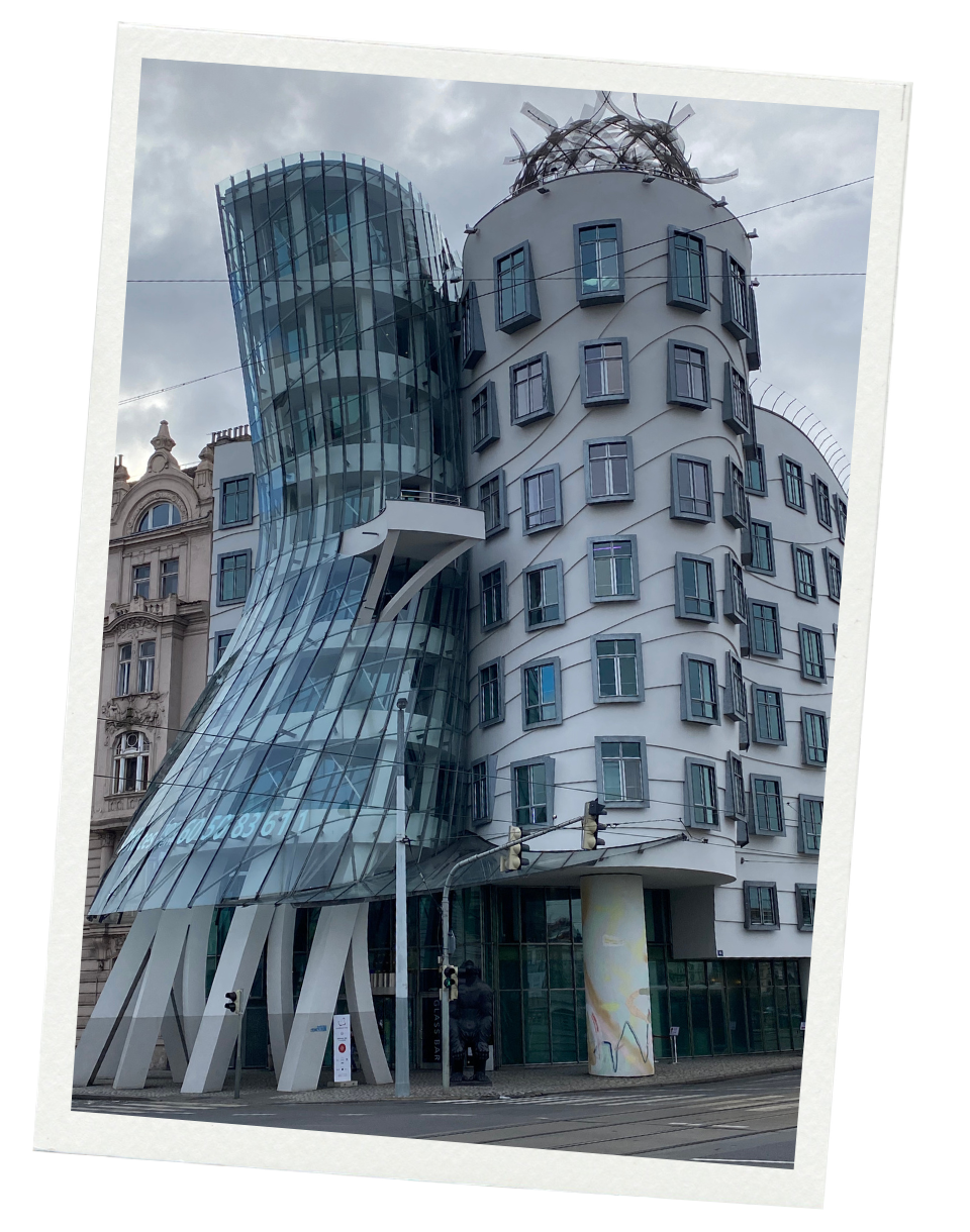 Our love of old historical buildings and cool modern architecture is equal. So, one building we wanted to visit first was the famous Dancing House, aka Fred and Ginger, named after dancers Fred Astaire and Ginger Rogers! The building belongs to Nationale-Nederlanden, a large Dutch insurance company. They built it in the 1990s, and it is a much-visited destination for Prague’s many tourists.