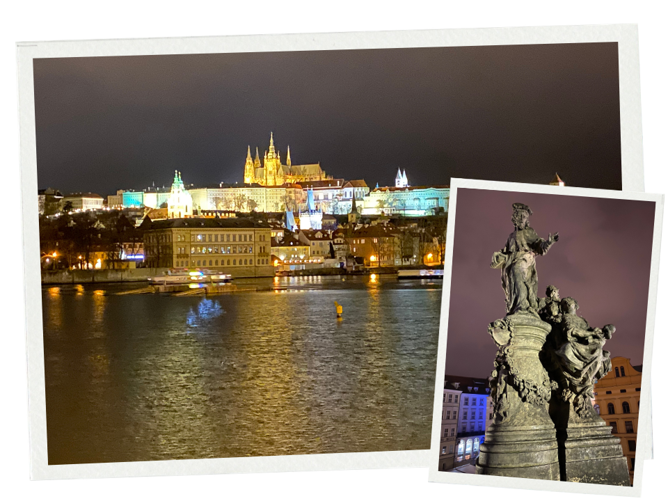 It was early evening and dark, so the view towards Prague Castle was beautiful. Everything was lit up, and reflections from the streetlights shimmered on the Vltava River.